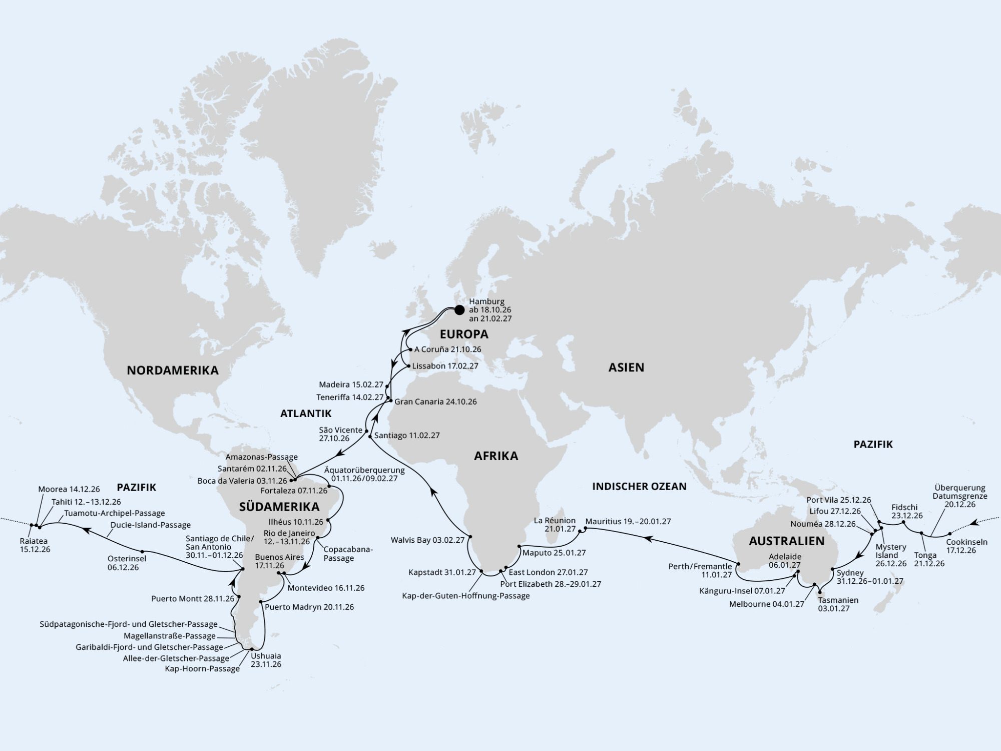 Auf Ihrer Weltreise reisen Sie nur noch mit leichtem Gepäck. Verstauen Sie Ihr gesamtes Gepäck auf Ihrer Kabine und machen Sie sich über den Transport während Ihrer Weltreise keine Gedanken mehr. Für Ihre Landausflüge packen Sie nur das in Ihren Rucksack, was Sie für den Tag wirklich brauchen.